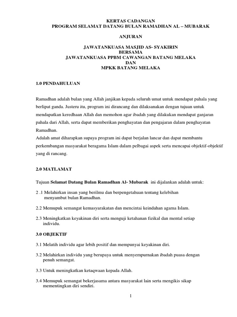 . KERTAS KERJA BAGI MEMOHON SUMBANGAN DERMA UNTUK TABUNG PEMBINAAN MASJID TAMAN PUNCAK JALIL BANDAR PUTRA PERMAI 43300 SERI KEMBANGAN SELANGOR DARUL EHSAN Alamat Surat-menyurat-Jawatankuasa Pembinaan Masjid Taman Puncak Jalil No. PENUTUP Diharapkan melalui Program Ihya Ramadhan ini dapat memberi kesan dan penghayatan. Kertas kerja ihya ramadhan sktd 2020.